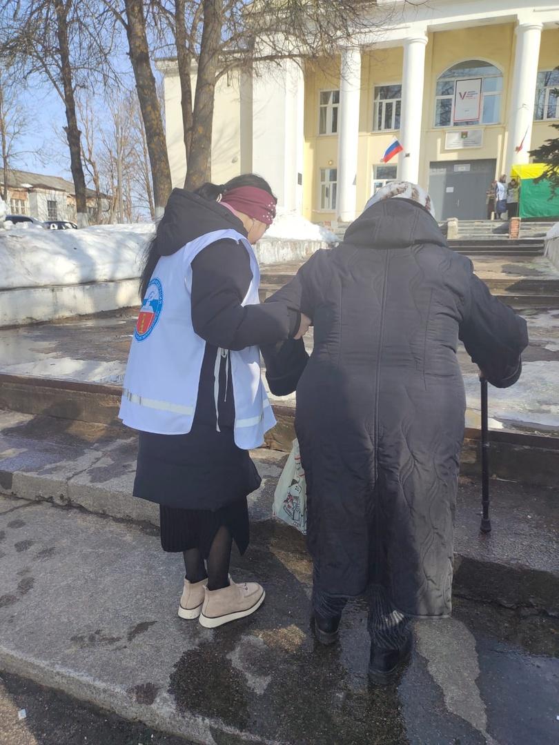 Ежедневно в дни голосования на выборах Президента России на избирательных участках волонтеры помогают избирателям подняться по ступеням, придержать входную дверь, сориентировать в здании, сопроводить до помещения для голосования и просто создать благоприятную обстановку.