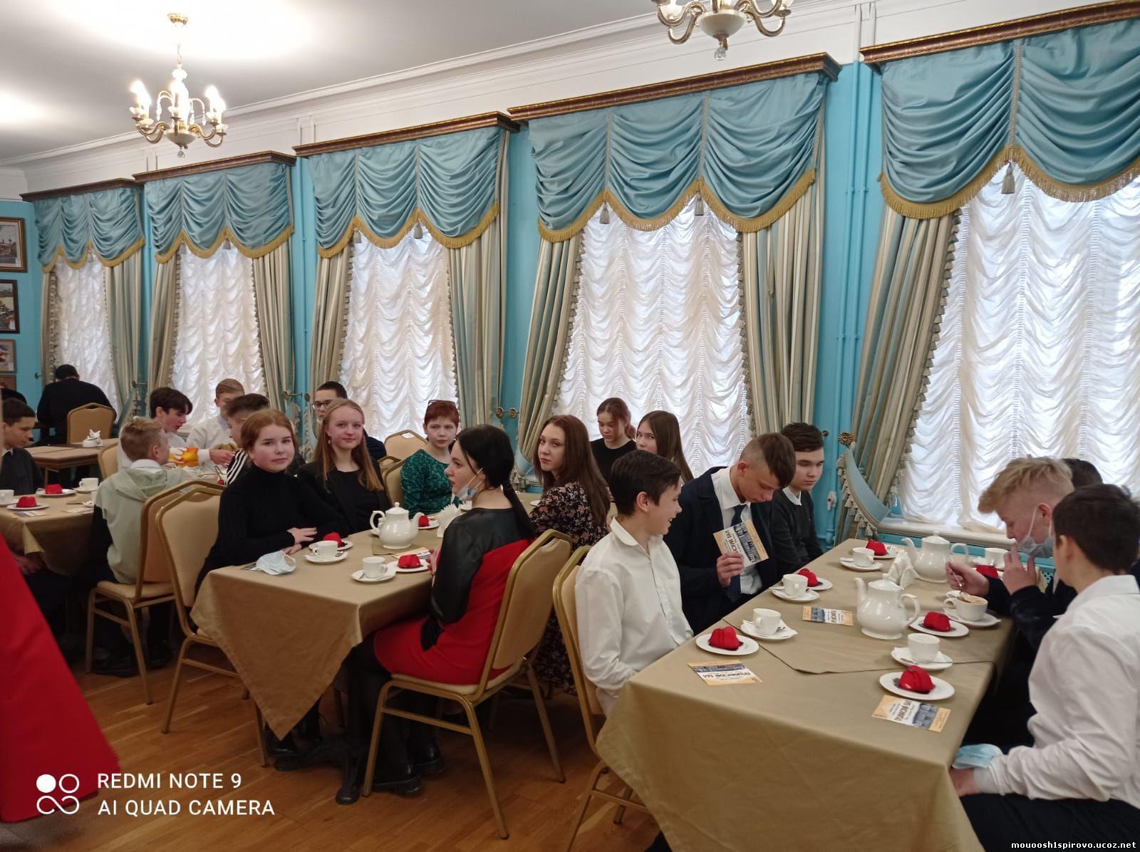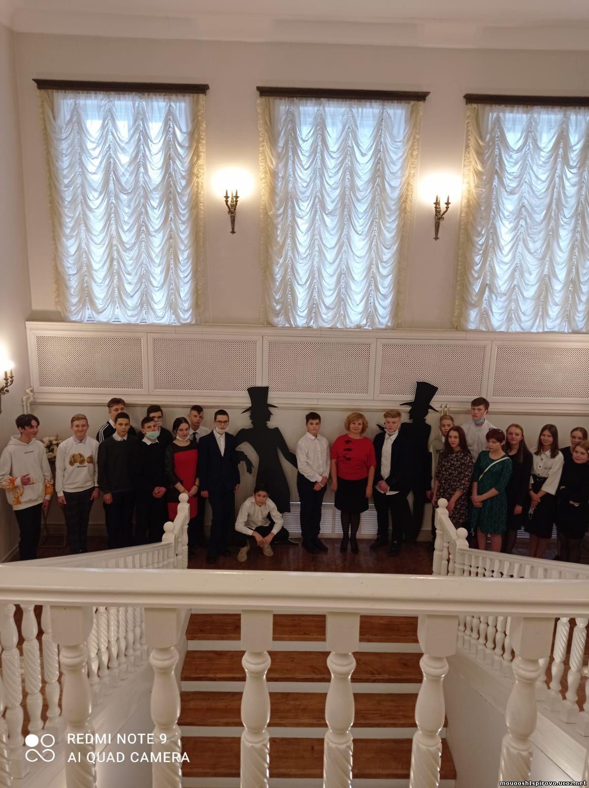 Именно в этом старинном городе 23 ноября побывали учащиеся 8 класса нашей школы вмести с классным руководителем. Посетили во время экскурсии несколько интересных мест: гостиницу Д. Пожарской, торговую площадь, музейные ряды... Особое впечатление произвёл на ребят Всероссийский историко - этнографический музей, ведь там они окунулись в атмосферу "Пушкинского бала". Им довелось стать участниками интерактивной литературно - музыкальной программы по IV главе романа "Евгений Онегин". Ребята были вовлечены в инсценировку романа "Евгений Онегин": с ряжеными, колядой, играми, в ходе которых образовались пары для танцев. Не обошлось и без подблюдных песен и гаданий. После бала хозяйка пригласила ребят в уютное кафе.