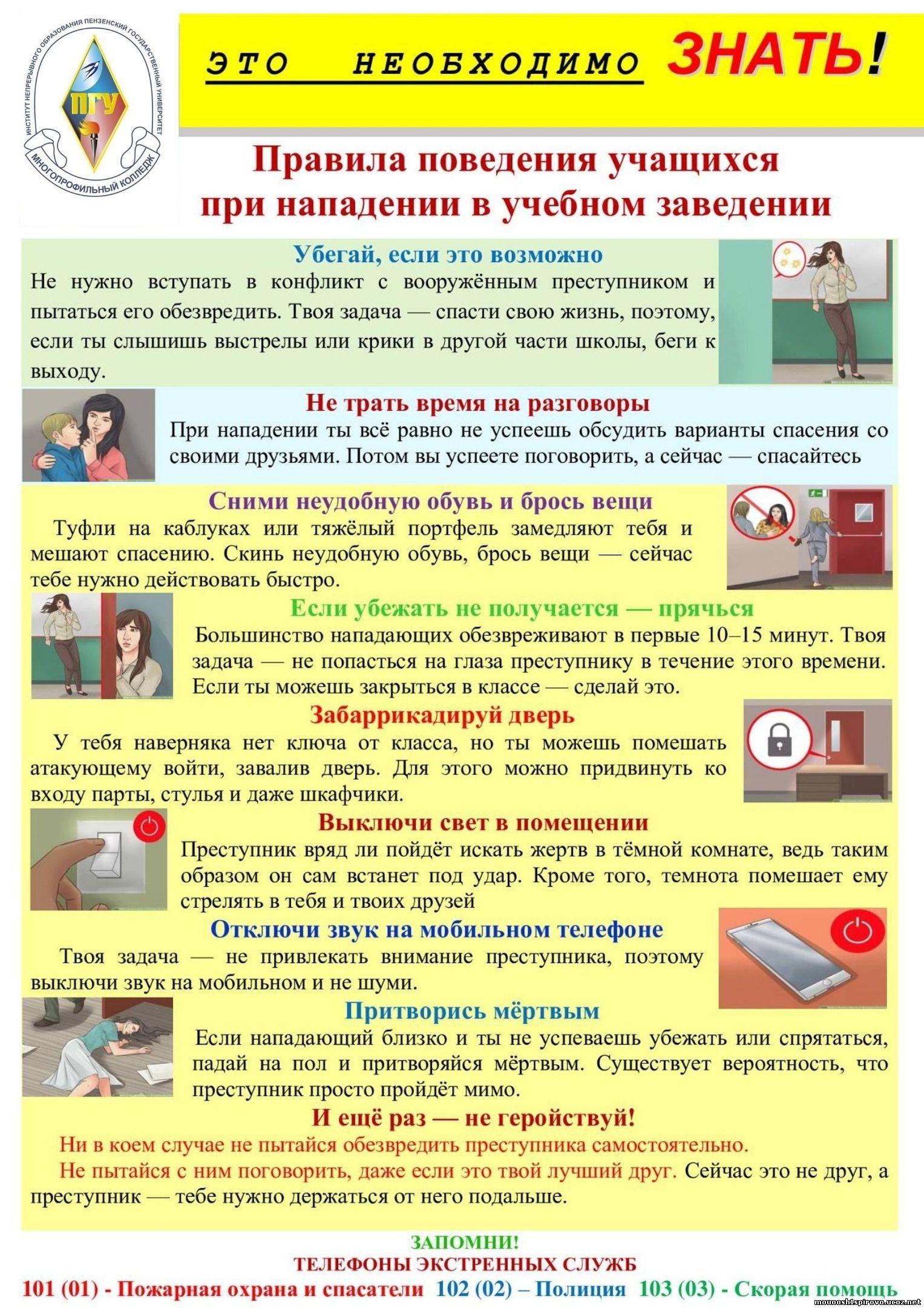 Если ты слышишь, что стреляют — беги наружу и так, чтобы толпа, обуянная паникой, тебя не затоптала. Беги так далеко от этого места, как сможешь. После того, как убежал — звони родителям и скажи, что с тобой все в порядке. Возьми себя в руки и вызывай полицию, говори четко и без лишних подробностей: что случилось и где.